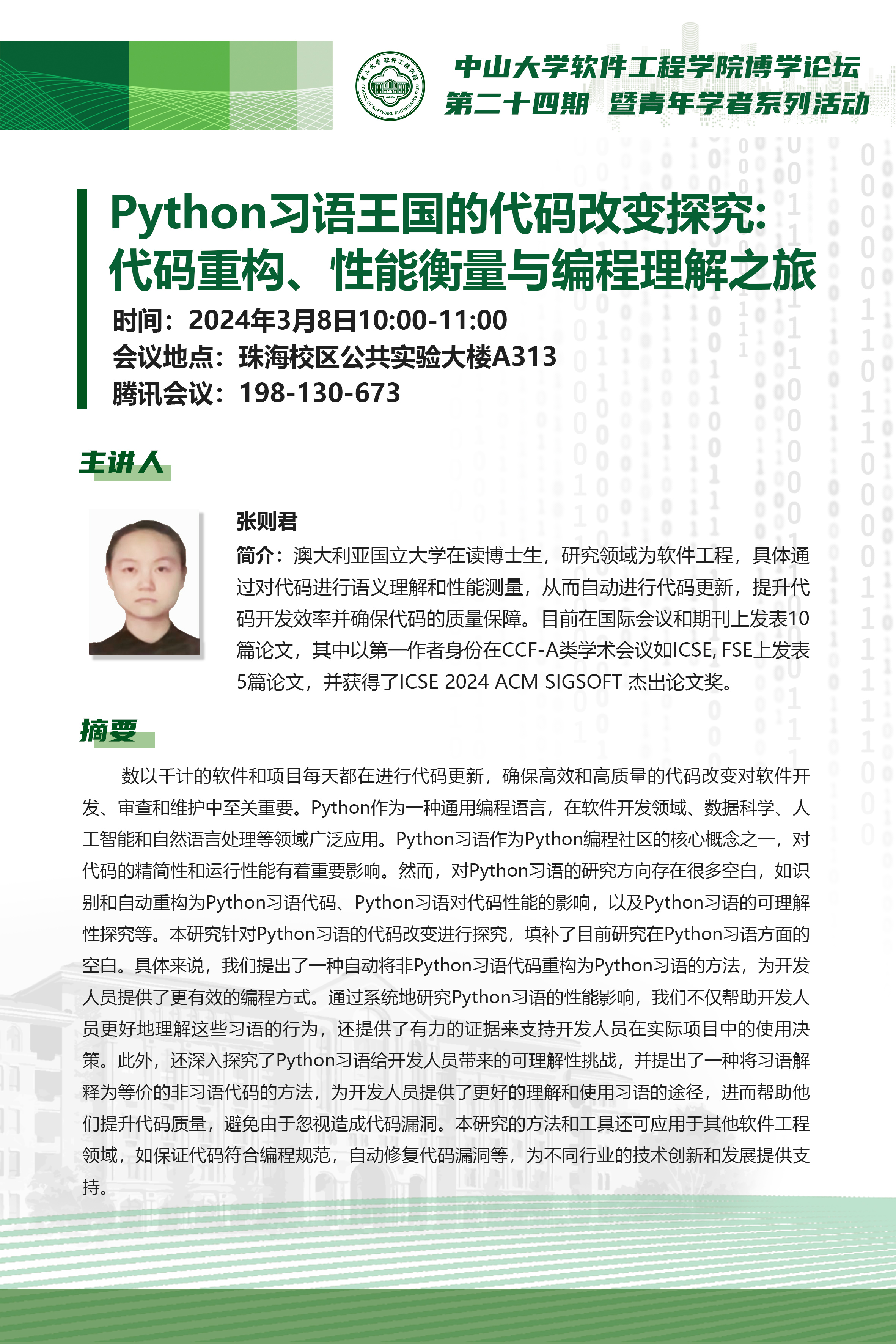导航痕迹 金年会jinnianhuicom 学术科研 学术讲座 博学论坛第二十四期:Python习语王国的代码改变探究-代码重构、性能衡量与编程理解之旅 博学论坛第二十四期:Python习语王国的代码改变探究-代码重构、性能衡量与编程理解之旅 发布人:林柱良 发布日期:2024-03-07