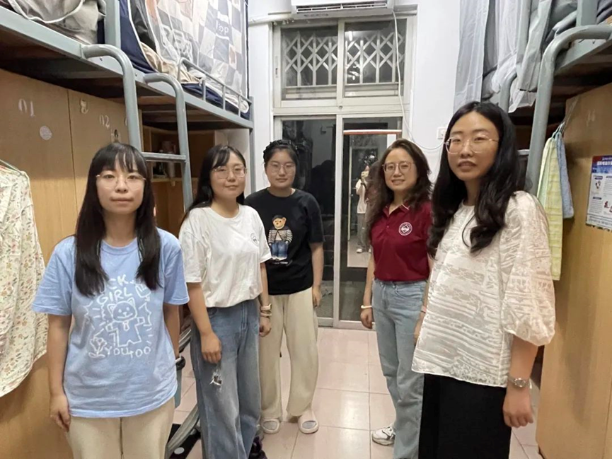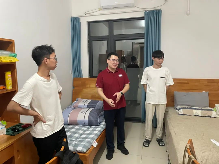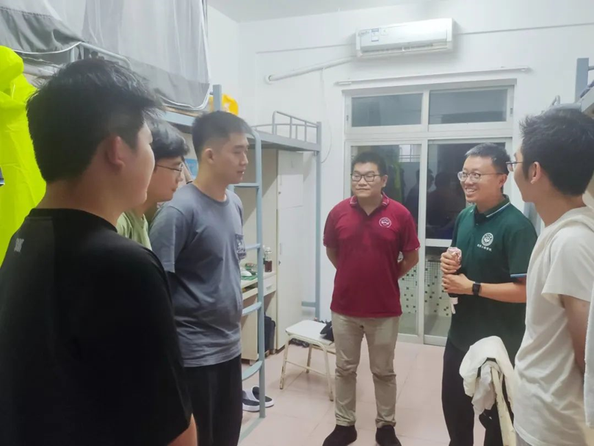 学院切实落实一线规则,深入联系学生社区,组织学院党委蓝澍德副书记、院长助理李丹副教授、研究生新生班主任刘名威副教授、南雨宏副教授、蒋子规副教授、团委书记林柱良老师及迎新志愿者们,于9月6日研究生新生报到当晚便进行了宿舍走访。