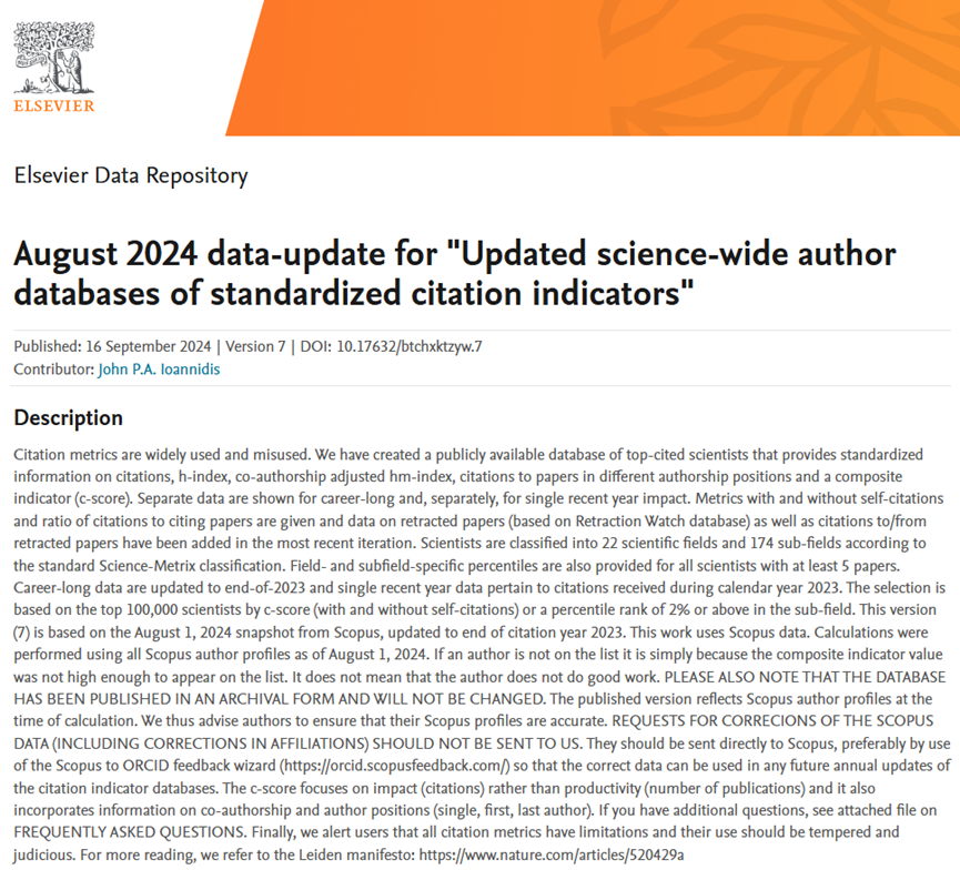 2024916日,美国斯坦福大学(Stanford UniversityJohn P.A.Ioannidis教授团队发布了第七期全球前2%顶尖科学家榜单(World's Top 2% Scientists)。榜单分为终身科学影响力排行榜”——关注整个学术生涯迄今的影响力,和年度科学影响力排行榜”——聚焦本年度(2024年)的学术成就。