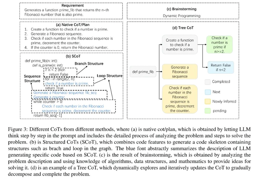 推理动作:严谨的推理过程是基于大模型的智能体完成任务的关键,而思维链(CoT)是最主流的有效推理方式。借助思维链,大模型可以深入理解问题,分解复杂任务,并生成高质量的答案。如Figure 3所示,现有工作探索了不同形式的思维链,包括朴素思维链/计划)(Native CoT/Plan)、结构化的思维链(SCoT)、头脑风暴(Brainstorming)、树形思维链(Tree CoT)等。具体地,朴素思维链/计划是在提示(prompt)中让大模型逐步思考,生成的回答中给出分析问题的具体过程并逐步解决问题(如Figure 3中(a)所示)。考虑到代码的特性,一些工作提出了结构化的推理模式来引入代码的结构信息,得到结构化的思维链。结构化的思维链以伪代码的形式呈现推理过程,涉及循环、分支等逻辑结构(如Figure 3中的(b)所示)。在提示中让智能体进行头脑风暴,利用算法、数据结构以及数学等知识给出解决问题的关键词,例如Figure 3中(c)给出了解决问题可行的算法作为头脑风暴的结果。树形的思维链动态地探索和更新思维链,树中的节点涉及已完成、新建、新推断、待定等多种状态(如Figure 3中(d)所示)。