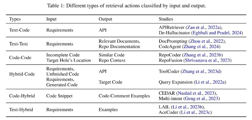检索动作:检索动作可以从知识库中检索相关信息,以辅助推理动作做出正确的决策。检索所用的输入和检索得到的输出内容有不同的类型。如Table 1所示,输入和输出可以是文本、代码,也可以是同时包含文本和代码的混合信息。现有的检索方法可分为基于稀疏的检索(sparse-based)、基于密集的检索(dense-based)和其他方法。Figure 4分别展示了基于稀疏的检索和基于密集的检索流程。基于密集的检索方法将输入转换为高维向量,然后比较语义相似度以选择具有最高相似度的k个样本;而基于稀疏的检索方法计算BM25或TF-IDF等指标来评估样本之间的文本相似度。此外,还有计算自然语言文本之间的编辑距离或代码片段的AST等其他的检索方法。