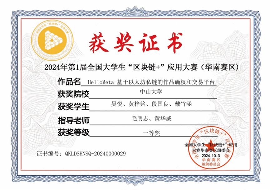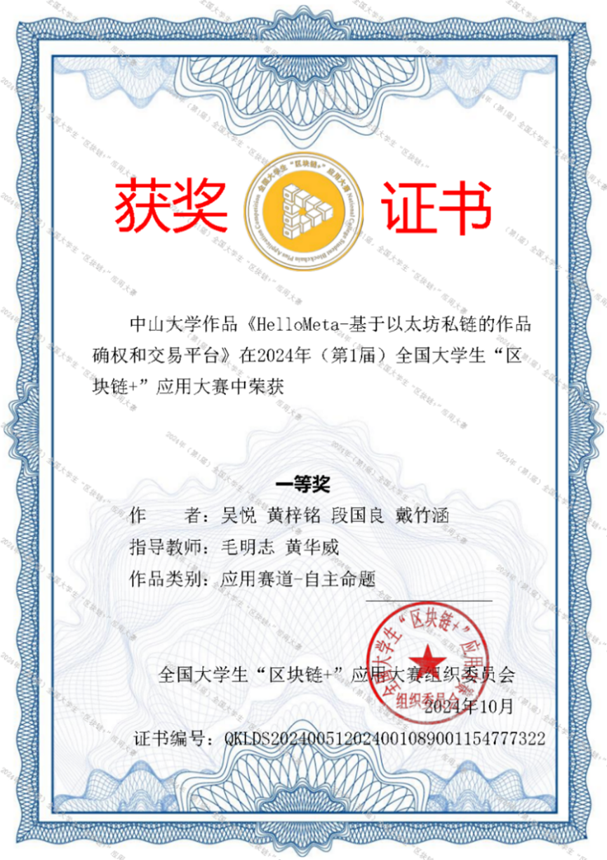 在刚刚结束的2024年全国大学生“区块链+”应用大赛中,金年会参赛选手本科生吴悦、黄梓铭、段国良、戴竹涵在毛明志、黄华威老师的指导下,凭借卓越的创新能力和扎实的实践技能,在全国众多高校中脱颖而出,首先获得华南赛区五省初赛一等奖,最终荣获国赛一等奖。