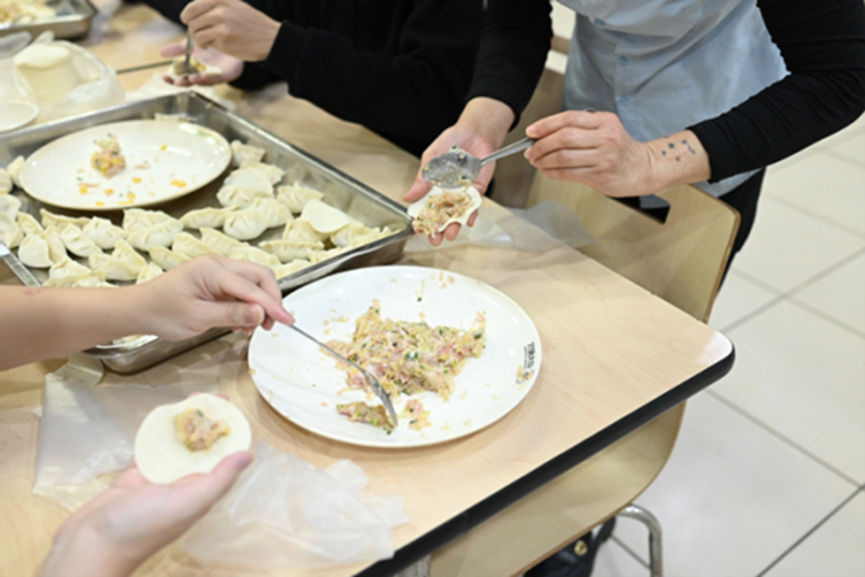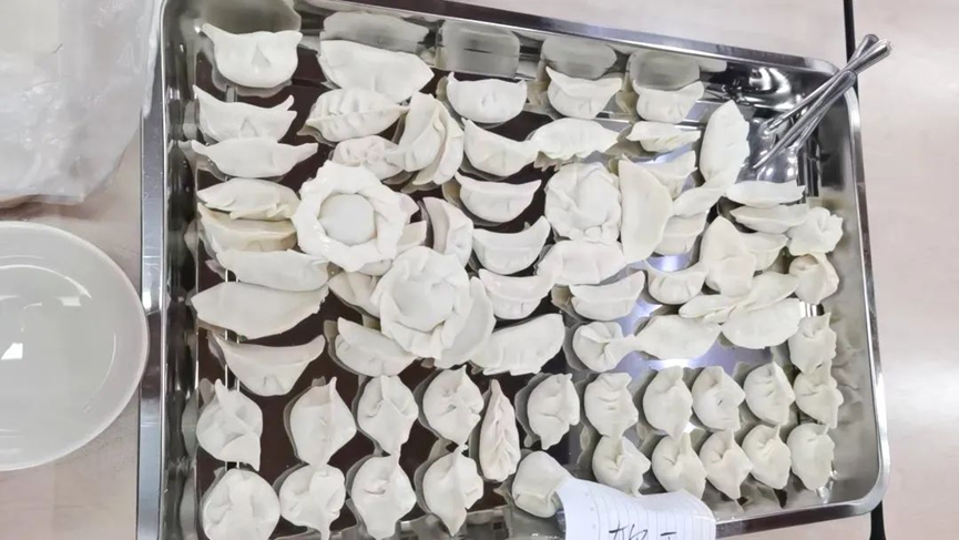活动现场,各位老师和同学将食堂一角布置成了“饺子工坊”,以迎接一场生动活泼的包饺子比赛。
