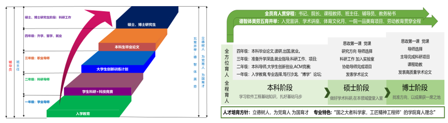 在人才培养方面,学院已形成“本-硕-博”一体化的人才培养体系,全程实施导师制。学院在开设软件工程基础课程外,还建立软件工程初、中、高三级实训课程群,开设十余门专业特色课程,课外开展博学论坛、笃行沙龙,引导学生参加创业创新大赛,提升学生实践能力,切实践行“三全育人”要求,实现德智体美劳“五育并举”,有机推动让教学相长的新时代科学育人体系。