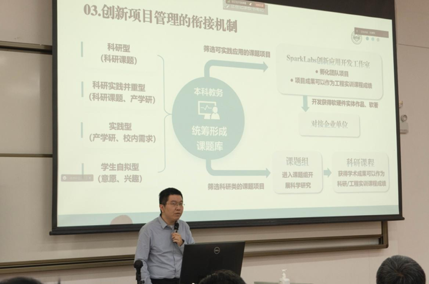苏玉鑫副院长围绕“学院本科生创新能力培养体系建设”,介绍了学院本科生培养体系架构、创新项目管理的衔接机制、学生参与创新项目指引等方面内容。他提出学院未来将提供给本科生两条课程路线:工程实训和科研课程,学生可以根据个人兴趣进行选择,最终成果可用于课程项目展示或毕业论文撰写。他还强调了大模型技术在软件工程领域应用的必要性,鼓励同学们钻研并掌握前沿技术。