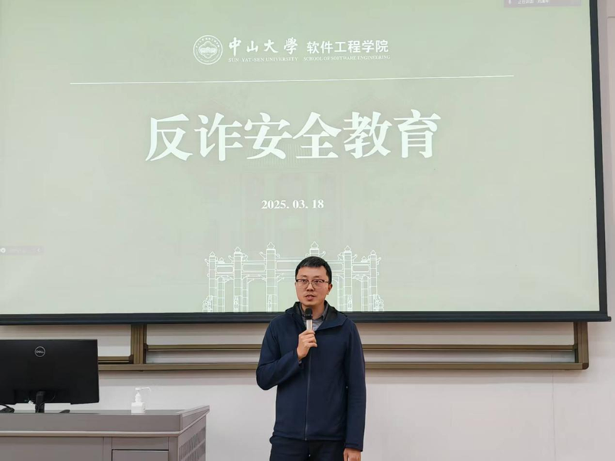 活动最后特别设置“平安校园建设”专题环节,蓝澍德副书记进行校园反诈安全教育宣讲,结合中大校园中切实发生的各类电信诈骗案例,给同学们介绍了八大类87种诈骗话术及常见的校园电诈类型,提醒大家遇到陌生电话或信息应立即切断联系,遇到不确定的情况可向学院老师或辅导员求助。此外,蓝书记也指出学院的反诈宣传群是同学们了解电诈方式与反诈知识的重要途径,大家平时可以多在群内相互交流反诈防骗心得。