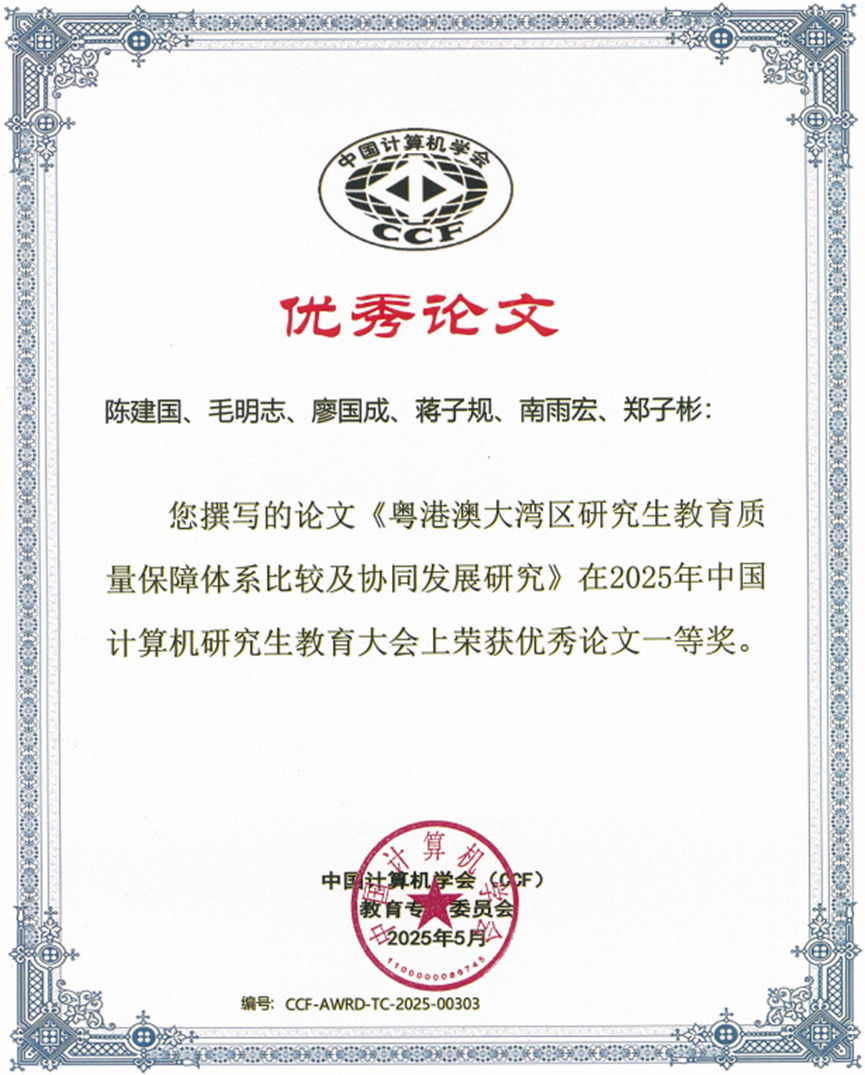 在该大会中,中国计算机学会(CCF)公布了2025年中国高校计算机研究生教育大会论文录用结果,金年会教师论文《粤港澳大湾区研究生教育质量保障体系比较及协同发展研究》荣获优秀论文一等奖。