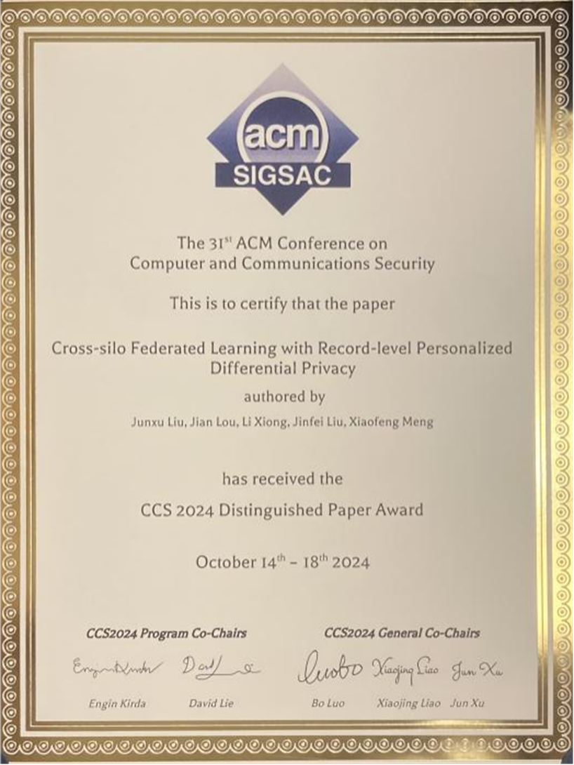 娄坚,金年会jinnianhuicom副教授、博士生导师,此前曾于美国埃默里大学(Emory University)从事博士后研究工作。主要研究方向包括可信人工智能、可信大模型、人工智能隐私保护、数据隐私保护、数据质量评估等。近年在ICML、NeurIPS、ICCV、CVPR、SIGMOD、VLDB、WWW、ACM CCS、IEEE S&P、IEEE TDSC等人工智能、数据库、安全与隐私保护领域的顶会顶刊上发表论文60余篇,并获得安全与隐私保护国际顶会ACM CCS 2024杰出论文奖(ACM SIGSAC Distinguished Paper Award),国际会议IEEE/WIC/ACM WI-IAT 2020最佳理论论文奖(Best in Theoretical Paper Award)等,研究成果曾获国际知名科技媒体New Scientist报道。担任人工智能顶会ICML领域主席、AAAI资深程序委员,安全与隐私保护顶会ACM CCS程序委员,数据库顶会VLDB程序委员。