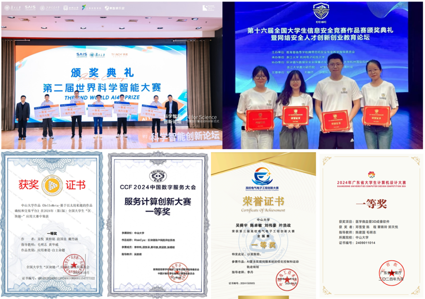 学院积极组织学生参加面向软件工程和人工智能知识应用领域竞赛,通过持续充实竞赛指导师资库,整合竞赛队伍支撑保障资源,建立以教师为牵引,学生为主体的竞赛指导机制。五年来,学院学生获得国际级、国家级、省部级科技创新竞赛奖项共100余项,其中包括第九届中国软件服务创新大赛一等奖、2024中国可信区块链安全攻防大赛冠军、第九届CCF中国数字服务大会服务计算创新大赛一等奖、第一届全国大学生“区块链+”应用大赛一等奖、第十六届全国大学生信息安全竞赛一等奖、第二届世界科学智能大赛一等奖等。