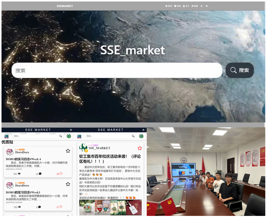 做身边的技术开发。为促进学院学生跨校区、跨年级高效沟通,学院软件工程实训课程的本科生团队基于学院师生信息沟通和交流的现实需求,开发了院内自主交流平台“SSE-Market”(软工集市)。软工集市以“软工人定义的世界,软工人守护的家园”为发展理念,坚持“服务软工全体师生”的宗旨,有效打破学院内部信息差、促进信息文化传承,得到广大师生认可。截至2025年6月,平台注册师生已达1000人,软工集市团队也由6个人的实训小组发展为38人的学生工程师运营管理团队。