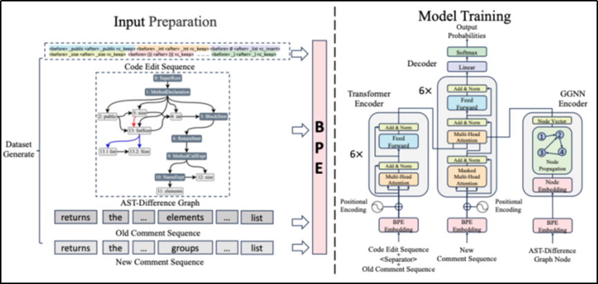 首先,在输入准备阶段训练BPE模型,将三种模态的token及节点值统一映射到向量空间,以便下游模型处理。随后,将旧注释序列与代码编辑序列通过特殊分隔符连接后,输入多层Transformer编码器进行自注意力建模,有效捕获长距离依赖关系,克服基于LSTM的传统方法在长序列处理上的信息丢失问题。最后,针对AST变更差异图构建各类边的邻接矩阵,使用Gated Graph Neural Network迭代传播节点信息,最终输出值节点状态向量,使模型能够深度理解代码结构层面的变更模式。