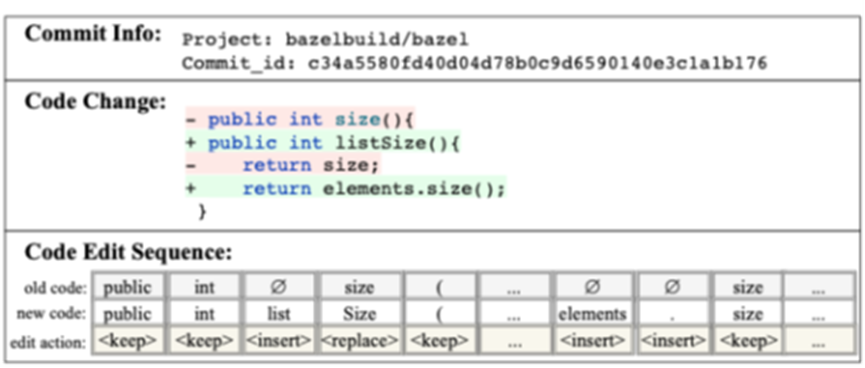 预处理阶段首先对旧注释进行清洗(移除URL、邮箱等无关信息),使用BPE分词得到token序列。研究数据表明大多数旧注释与新注释在词汇和结构上高度相似,这一特性使得将旧注释作为输入既有助于捕获主要语义,又能降低解码难度。对于代码变更的表示,本文对变更前后代码进行分词,基于token级对齐算法生成增、删、改三种编辑操作的token序列,最终将旧代码token、新代码token及编辑操作token组织成线性序列输入。该序列能精确反映逐token的代码变更,为模型提供细粒度修改信息。