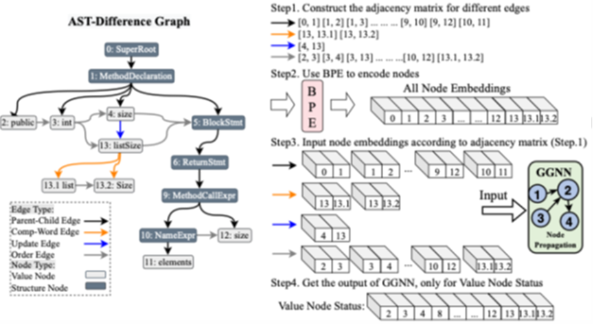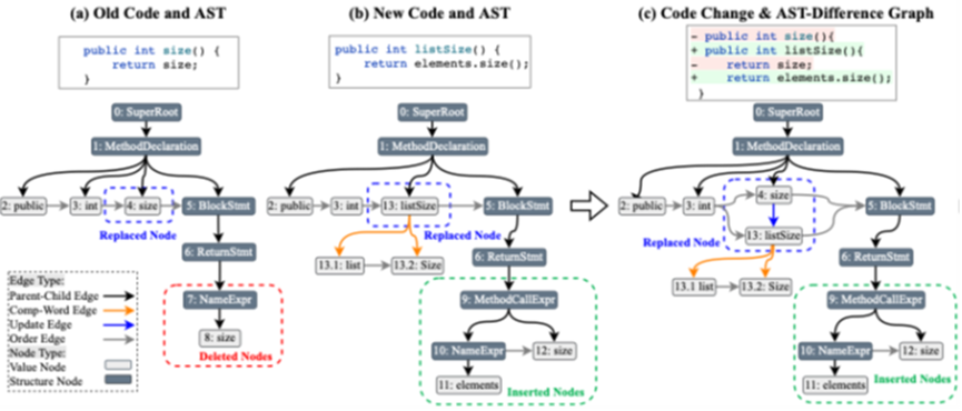 利用代码静态分析工具提取变更前后抽象语法树(AST),通过比较节点的增加、删除和更新,构建包含多种边类型(父子结构边、Token分词边、节点更新边、节点顺序边)的有向图。该图能够捕获代码结构层面的变更信息,可有效弥补文本序列的信息缺失。
