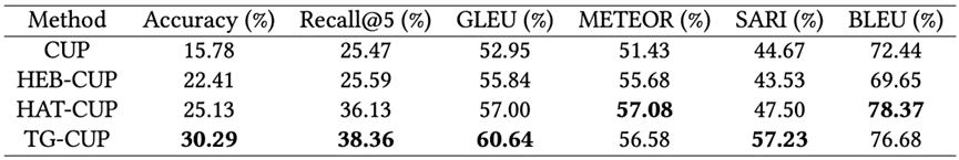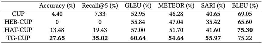 为了全面评估TG-CUP的性能,本文将其与三种代表性方法进行了对比:CUP(基于Seq2Seq的早期方法)、HEB-CUP(启发式规则驱动的注释替换方法)、HAT-CUP(结合RNN与结构注意力的混合模型)。