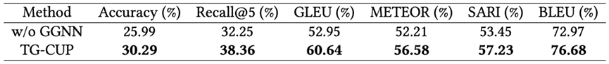 为验证AST变更差异图的实际贡献,本文进行了消融实验。实验表明在去掉AST变更差异图后,TG-CUP的准确性下降了4.3个百分点,其他评价指标同步显著降低。这一结果充分证明AST变更差异图有效补充了序列表示的不足,使模型在面对复杂代码更新时更具敏感性与鲁棒性。