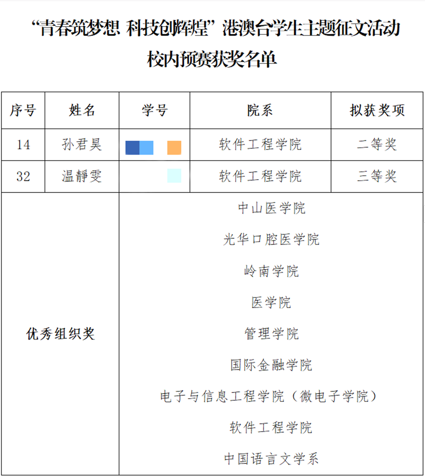 为贯彻落实党的二十大精神,激发港澳台青年学子的爱国奋进精神,进一步展示内地(大陆)高校港澳台学生群体精神风貌以及近年来内地(大陆)高校培养港澳台学生的丰硕成果,金年会jinnianhuicom举办“青春筑梦想 科技创辉煌”港澳台学生主题征文活动校内预赛。金年会jinnianhuicom2023级本科生孙君昊荣获二等奖、温静雯荣获三等奖,学院荣获优秀组织奖。
