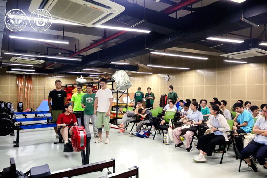 划桨机前,学院龙舟队成员给同学们科普龙舟训练的流程,同学们有力地拉动桨柄,体验划龙舟的快乐;乒乓球台两端,小球在清脆的击打声中快速往返;羽毛球馆内,同学们灵活移动步伐,每一次精准的扣杀都与敏捷的走位相互配合;篮球场上,默契的传切球和精准的投篮,不时引发观众的欢呼。这些体育活动不仅让同学们锻炼了身体,也为课堂学习注入满满能量。